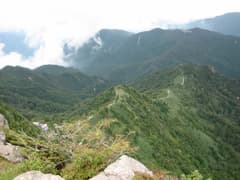 三角点は砕石を土俵のように積み上げた中に鎮座していて、ご丁寧に注連縄まで土俵俵のように巻かれている。頂上はガスに覆われていたが、やがて青空が広がって、隣りの次郎笈へ続く緑のビロードのような稜線が垣間見えた。