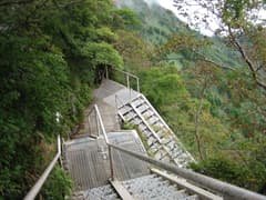 続いて、三ノ鎖(ここも捲き道あり)。垂直の岩場に見えて、ちょうど先行している人が鎖場上部を登攀中だ。ちょっとビビる。鎖場の下には売店があり、今日は開店していないが、営業していたらお茶して落ち着きたい所だ。
