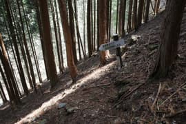 小ピークから一旦少し下り、小ギャップの底から露岩に木の根が絡む急坂を登る。急坂を登り切った地点に「落石・足元注意!」という文字が掠れた看板がある。露岩の多い尾根をアップダウン。一部は小さな岩稜となっている。再び急坂の登りとなり、また「落石・足元注意!」の看板を通過。大岩が現れ、右から巻く。この辺りから残雪が現れる。先行者のトレースは全くない。小さな岩場を越え、杉林に囲まれた尾根道を登ると「奥秩父自然遊歩道№26-2」の道標のある地点に着き、ここで右から本谷コース(廃道)を合わせる。このすぐ先が1238m標高点のピークで、杉やアセビに囲まれた小広い平地となっている。