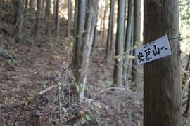 左岸の山腹をトラバースする。右側の谷は小さいが、意外と深く険しい。薄暗い杉林の中に入って山麓に近づくと、他のいくつかの林道との合流点がある。下りで迷う個所はないが、登りの逆コースで迷いそうな分岐には、安戸山への登山道を示す古い案内プレートが設置されている。
