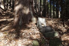 小さな枝尾根を越える所に2本の杉の大木があり、その下に潰れた石祠がある。ガイド本に御神木と記されている杉の木で、その名に相応しい風格がある。