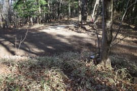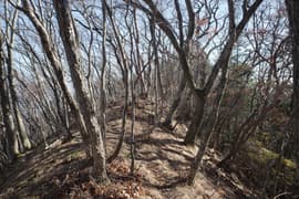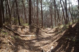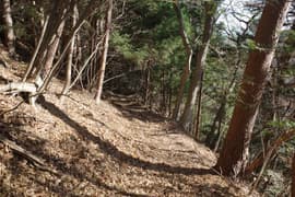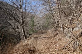 この山道は、昔はよく歩かれていたようで、幅広く堀割り状となっている区間もある。冬枯れの雑木林の中、陽が差し込んで明るく、落ち葉をカサコソと踏んで気持ち良く下る。