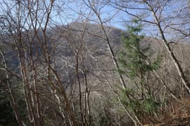 左岸の山腹を斜め右上に登ると「←安戸山へ」という道標がある。大きくジグザグを切りつつ、杉植林の山腹の高い所をトラバースして谷間の奥に入って行く。道型ははっきりしているが、枯れ杉の葉に覆われて、歩く人は多くない様子。日陰の道が続いて、歩いていても冷え込みを感じる。