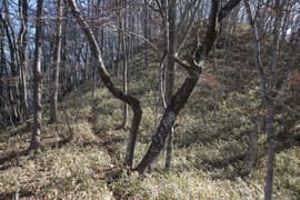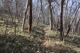 のんびり昼食休憩をとったのち、頂上稜線を南東に下って道の駅に向かう。最初は笹に覆われ、少し急な尾根を下る。笹原の中の踏み跡は微かだが、樹林は疎で藪もなく、歩くのに支障はない。
