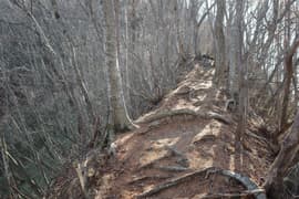 1055m標高点峰へ少し登り返し、冬枯れの雑木林に覆われた稜線を辿ってピークを越える。再び丈の低い笹原が下生えの杉植林に入り、緩斜面を下ると林道に出る。この地点に道標はない。林道の路面にはキャタピラの跡が新しく、工事用車両の往来があるようだ。