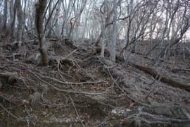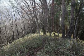 笹に覆われた緩斜面を斜上し、安戸山北面の急な斜面のトラバースに入る。道型は細く、足元は急斜面で切れ落ちて、なかなか高度感がある。木の間からの眺めになるが、安戸山から北西の弥太郎山方面へ緩く上下しながら延びる稜線が見えて、興味を惹かれる。