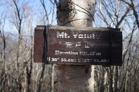 頂上はそんなに広くはないが小平地となっている。中央に三角点標石があり、一角の岳樺の幹に「Mt. Yasuto 安戸山 Elevation 1151.47m N36°58.688 E139°52.484」の文字が掠れた木製の山名標識が掲げられている。緯度、経度を度(degree)単位やDMS形式でなく、DM形式で書いてあるのが目新しい(後日調べると、航海や航空の分野では、国際的に標準で用いられているらしい)。