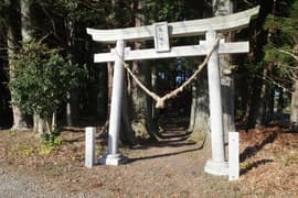 集落を離れて杉植林の中の細い車道となり、石段道が分岐する。これはどっち?取り敢えず石段を上ると、すぐに車道に合流して、小さな神社が現れる。後日調べると、この神社はWikipediaの蟇沼の記事に温泉神社として記載されている。