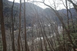 登山道は薄暗い針葉樹林を抜けると冬枯れで明るい雑木林の斜面に入り、急斜面をトラバースして登る。幅狭い山道で、落ち葉に覆われているが道型ははっきりしている。なかなか野趣に富む楽しい道だ。高度が上がると、木立を透かして川治温泉駅付近の街並みが俯瞰できる。