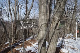 頂上は小広く、樹林に囲まれているが、この時期は冬枯れで明るい。木の間を透かして川治温泉を俯瞰し、高原山も見えて、意外と展望が得られる。木立には懐かしいN氏山名標識が架かる。設置されてから、多分20年くらいは経っているのでは。手彫りの白文字も流石に消えた箇所が目立つ。