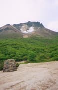 沼原池から樹林をジグザグに登り、白笹山へ。頂上からの展望はないが、少し進むと笹原を交えて意外と高山チックな南月山への尾根が見える。黒尾谷山も低いがなかなか鋭い山容を見せている。南月山の頂上は賑わっていた。祠や地蔵があり、砂礫の尾根が茶臼岳へのびる。茶臼岳の無限地獄から噴煙が勢い良く上がっている。