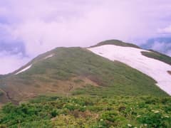 桜ゾネからは、これまた雄大な守門岳を後ろに背負いながら、ブナの疎林をゆるゆる登る。ちょっと急になると嘉平与ポッチ下のピークに出て、一気に展望が開ける。八海山も見える。雪渓から吹き上がる風が涼しい。