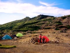 細い尾根をアップダウンして切合へ。このあたりから高山らしくなる。草履塚はΛ←こんな形の雪渓のそばを気持ち良く登る。少し下って、御秘所の岩場を通過。最後の急登で一ノ王子の小ピークを越えると幕営地。ここにテントを張る。水場も近い。本山小屋に幕営料を尋ねると今のところは無料とのこと。ビール(@900円)を買う。気持ちの良いテン場で夕飯+お酒を頂き、長い歩きの疲れもあって速攻で就寝する。