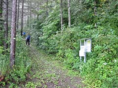 少しの急登で見晴らしの良いピークへ。このあたりはシャクナゲのトンネルになっているので、花の時期には見事かも。鞍部に下ると、木次原と下新井へ下る道の道標があるが、どちらへも道はほとんど消えている。ここから一登りで新しい避難小屋に着く。8月にできたばかりだそうだ。広くてさすがに綺麗。
