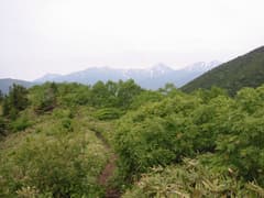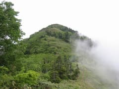 新道分岐から少しずつ急な登りになり、ダケカンバやササ原が現れると稜線は近い。しらたま平からは御巣鷹山や、火打山、焼山、雨飾山、高妻山が見える。残念ながら古池や野尻湖は雲の下。でもまあ、これだけ展望があれば満足。