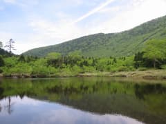頂上から稜線を北へ。鬱蒼としたコメツガ林の中を行き、黒姫乗越から火口原に入る。ここも樹林だが、突然開けると短いササ原の中に七ツ池。さらに進むと峰ノ大池。水面に逆さに写る黒姫山の稜線が素晴らしい。ここで昼食にする。