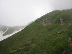 桐生を前夜、車で発って3時間で遠見へ。テレキャビンの始発は7:30だが、既に多くの登山者の行列待ち。さすが人気が高い山だ。片道840円+荷物10kg以上200円は以前と変わっていない。アルプス平はガスの中。団体の後ろについて登る。前回、小遠見山まで来たので、その頂上はよく見覚えがある。中遠見、大遠見、西遠見はピークらしいピークがなく、ガスで展望もないので単調だ。西遠見を過ぎると、最後の急登となり、ガスの中に山荘が見えてくる。白岳のピークから山荘はすぐ。