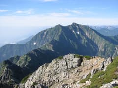 翌日、早朝は快晴。目指す五竜岳山頂はごつごつした岩肌を見せている。大勢の登山者に混じって登頂。頂上からは白馬、唐松、鹿島槍、立山、剱と、素晴らしい眺め。しばし、楽しむ。