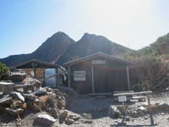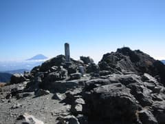 再び登りにかかり、塩川新道を合わせて塩見小屋へ。ここも一部開放。天狗岩を越え、岩をつかむ最後の登りで西峰に到着。東峰越しに富士山が見える。東峰まで行って、3,000m峰の頂上で大展望を一人占めし、眺めを酒菜にビールを飲んでラーメンを作る。岩陰で風を避けていればあまり寒くはない。