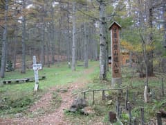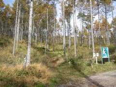 杖突峠にはなんとかアジア園の施設と広い駐車場と「守屋山登山口」バス停がある。ややこしいことに「杖突峠」バス停は茅野側に下った茶屋の前にある。駐車して峠周辺のカラマツ林の黄葉を見ているとなかなか良い雰囲気だったので、よーし、守屋山に登ってみよう、という気になり、準備をして歩き始める。