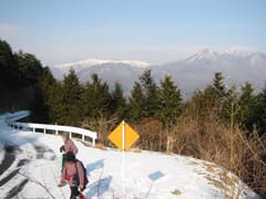 西那須野ICで東北道を降り、登山口の光徳寺へ。雪を纏った那須と大倉山が高い。車道の脇のスペースに車を置く。山門のすぐ左隣の砂利道が百村山への入口。暗い杉林の道を歩くと水道記念碑のある十字路で、登山口の標識がある。杉林の中のジグザグ登りから緩い尾根歩きとなり、林道を横切る。ここからは那須連山がよく見える。このあたりから雪が多くなる。
