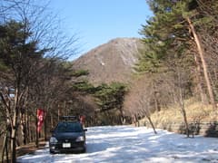 国立赤城青年の家を経て森林公園荒山登山口の駐車場まで車で入る。なお、登山口から先の車道は現在通行止である。また、駐車場付近の路面の状況は左上の写真のとおり。来る途中の鍋割山の登山口には4〜5台の車があったが、こちらは他の車はゼロ。静かなものである(あとから1台やって来た)。