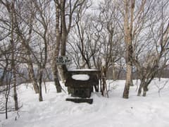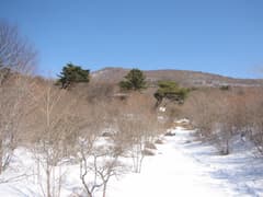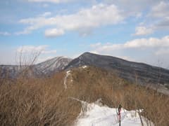 登山口からしばらく林間を登ると、緩くて広い高原状の尾根になる。行く手は鈍角三角形の荒山へ向かってゆるゆると高まっている。左には鍋割山が急峻な山腹を見せている。荒山高原・赤城温泉への分岐を過ぎ、林間を巻き気味に辿る。軽井沢峠への道を分けると、ちょっと小枝がうるさい尾根を登って荒山へ。地蔵岳が寒々と見える。荒山頂上は木に囲まれているが、西側に眺めの開けるところがあり、そこから谷川連峰や尾瀬の山々が良く見えた。さすがに真っ白。尾瀬方面のスキー場も白い帯のように見えている。上信越国境の白い山々の前には子持山や小野子山がちょこなんと鎮座している。