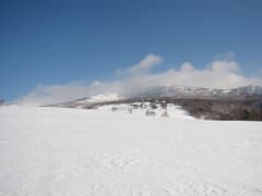 登山口からしばらくは林間で、これを抜けると牧場の広大な雪原に出る。行く手に四阿山が見えるが、上の方は速い雲の流れの中である。牧場を過ぎ、夏道をショートカット?してシラカバ林の中をトラバースしていく。ここは風が当たらなくて気分は良かったが、主稜線に近くなってくると、風でガリガリの雪か、吹き溜ってふかふかか、のどちらかで歩きにくい。シールも滑りがあまり良くなくて結構疲れて来る。