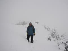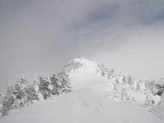 頂上への最後の登りは少し狭くなった雪稜。今日登るは私が最初らしく、ほとんど消えたトレースを辿る。頂上は細長く、両側は急峻な雪の斜面で、落っこちるとはい上がれないだろうなー、などと考えつつ、雪庇の陰で風を避けてパンの昼食をとる。そうこうしているうちに、単独行のおじさんばかり3人ほど上がって来た。そのうちの一人の方に頂上をバックにして撮ってもらったのが右下の写真。