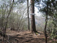 頂上から峠に戻り、南へ高原山への尾根を辿る。少しの登りで「山田山」という標識のある825mピークを過ぎると、新緑の雑木林に囲まれた緩い尾根道となる。気分が良いが、右手の山腹は部分的に伐採されて植林されているので、伐採が進んでこの気持ち良い雑木林がなくなってしまわないか、ちょっと心配だ。