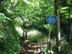 車道の終点が甲子温泉で、一軒宿の大黒屋がある。現在のR289は、ここから甲子峠を越える登山道となる。今日の計画は、このR289を経て旭岳に登ろうというもの。宿の前を通り、水量がとても多い阿武隈川本流を細いコンクリート橋で渡る。橋の手前と、橋を渡って少し登った所の二か所に、その筋には有名?な国道標識がある。なんでこんな山道に国道標識が設置されたか(全国でここだけらしい)は、「KOKUDOU.COM」のKokudou Quest '99No.84に紹介されているので、興味ある方は訪問して見て下さい。