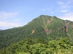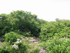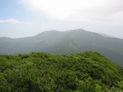 甲子峠へ向うR289を右に分け、少しの急な登りで甲子山の頂上へ。ここで展望が開けて、これから登る旭岳が行く手に聳える。稜線上には頂上への道も見えるので、良く偵察しておく。このあたりの稜線は風の通り道になっているようで、灌木帯になっている。今も風が涼しい。