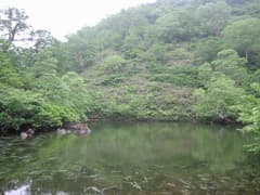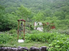 新道と合流してすぐに坊主沼に到着。幽玄な感じの沼だ。沼のほとりには鐘と避難小屋がある。ポツリポツリと小雨が降り出し、坊主沼の水面に雨粒の波紋が広がり始めたので、小屋の中に入って一休みさせて貰う。中は綺麗にしていた。入り口に掲げられたプレートによると、1955年5月の白河高校山岳部の遭難を期に建設されたとのこと。