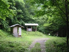 熊穴橋から細い林道に入る。四駆ならば通行できる道だが、歩いても20分程度だ。林道終点の白ハゲ口広場には東屋とWCがある。最近、刈り払いされたようで、テントが張れそうな居心地の良いところだ。