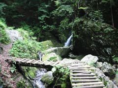 右の川のコースを辿ると、まず、暗いゴルジュの中を豪快に流れ落ちるタイコオロシの滝が現れる。これを高巻いて越え、三滝の滝壺へ。右から狭いルンゼを流れ落ちる滝で、全体の落差は45mあるそうだが、滝壺までいっても見えるのは下段のみである。滝壺から展望台に登る。ここからは木が葉を落した時期には滝の全容が見えそうだが、今日は緑が多いので、部分的に水線が見えるだけだった。展望台は滝壺からかなり高い位置にあり、足下は絶壁でちょっと緊張する。