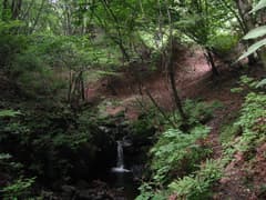 ゆっくり涼んだ後、西沢口への道を下る。尾根を歩き、途中で道標に従って左の白ハゲ沢の源頭に入る。沢沿いの道を下ると、だんだん水量が増え、谷が大きくなってくる。ワサビ田を過ぎると山のコースの途中に出る。ここの道標には熊鷹山方面への記述がないので、登るときは迷いそうだ。