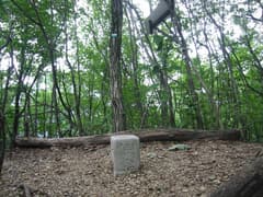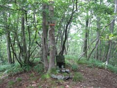 稜線を南に戻って石碑のある分岐を左へ登ると、石祠と「氷室山」の標識がある小ピークに立つ。1154mの三等三角点はもうひとつ南の小ピークで、山頂には宝生山の標識がある。縦走路は巻いているので、真っ直ぐ尾根を登るべし。標高差はほとんどない。