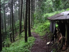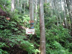 分岐に戻り、左へ杉林の中を急登する。杉の根元に雨宿りしていたセミが、近づくと飛んで逃げていく。やっかいなことに、セミに紛れて、でっかいアブがつきまとってくるのがちょっとイヤ。