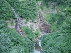 赤谷林道終点の標識があり、そこから赤谷川の左岸を辿る山道になる。道幅が狭くて外傾しているので歩きにくく、急傾斜の山腹の高いところをトラバースする個所もあって、滑らないように神経を使う。美しいブナ林の間から、朝日の当たるエビス大黒あたりのごつごつした稜線を眺めつつ歩くと、雄滝、雌滝の良く見える展望台。ここから赤谷川の渡渉点はすぐだ。