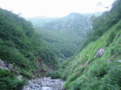 しかし、ここからがまだまだ長い。大源太山から黒金山へ道は、ササが幅広く刈り払いされ、整備が非常に行き届いた道だ。黒金山からの下りの道も歩きやすいが、樹林で展望がなく、登りに使うとかなり単調そう。途中の水場(距離50m)は期待していなかったが、ササ原の中から冷たい水が流れ出ていて、大いに助かった。最後は滑りやすい急なジグザグ下りとなり、ようやく渋沢林道に着く。ここから長い林道歩きで川古温泉へ。