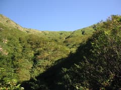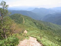 渡渉点からは上流に向かっての渓谷の眺めが素晴らしい。川幅が広く、水量も少なくないので、無理せず靴を脱いで川を渡る。滝となって赤谷川に落ちるウラエビス大黒沢の左手脇のザレをよじ登り、小さな沢を2、3本横切って本格的な登りにかかる。太陽が高くなり、谷間のブナ林の中にも日が差してくる。幅広く刈り払いされて登りやすい道だ。やがてササ原に出ると、道は少し草深くなるが、稜線を見上げながら毛渡乗越まで一直線の登りとなる。