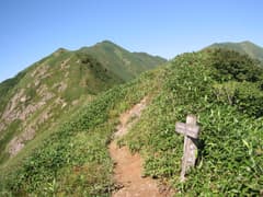 毛渡乗越からは痩せた稜線歩きで、展望を楽しみながらエビス大黒ノ頭に登る。振り返ると、万太郎山とその奥に谷川岳が見える。エビス大黒避難小屋は2人くらいは泊れそうな広さだ。避難小屋から草原の少し急な登りとなり、傾斜が緩くなると仙ノ倉山の山頂だ。