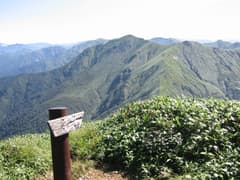 平標山ノ家から大源太山への稜線は、これまでと雰囲気がガラッと変って、樹林帯の中の道となる。風も弱く、ところどころ樹林の切れた尾根は陽射しが強烈。大源太山への標高差は対してないのだが、暑さでかなり参ってくる。三国山への縦走路と別れ、樹林の中を大源太山へ最後の一登り。辿り着いた山頂からは、今日歩いて来たエビス大黒ノ頭〜仙ノ倉山〜平標山が良く見え、しばし充実感に浸る。