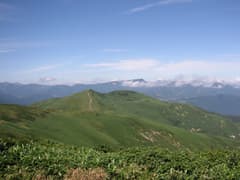 毛渡乗越に飛び出ると大展望。東は万太郎山、西はエビス大黒ノ頭〜仙ノ倉山へとササの尾根が繫がっている。北面は飯士山や麓の岩原スキー場が見え、そちらから吹き上がってくる風が涼しい。登って来た南面は遥か下に赤谷川の川底が見える。
