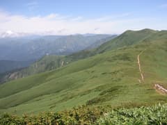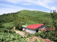 平標山からササ原の緩い尾根を平標山ノ家へ下る。山ノ家はトイレと水汲み場(小屋の裏手)があり、小屋の前には小さなベンチもあるので休憩するのに良い。缶ビールも500円で販売しているみたいだったが、管理人さんが席をはずしている模様だったので断念。まぁ、冷たい水が補給できたからいいか。