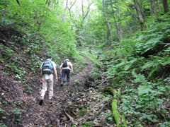 最初は杉林の中を登るが、すぐに沢沿いの道となる。最終水場を過ぎ、左へ山腹を上がっていくと小尾根の上に出る。「天望台←」という標識があり、すぐ左手の送電塔のある小広場を指し示しているが、樹林に囲まれて展望はない(天が望めるという意味らしい)。