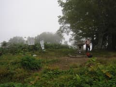 山頂は周囲を樹林に囲まれているが、ササが刈り払われて小広い草原になっていて、その一角に石祠がある。