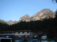 国民宿舎裏妙義の駐車場は宿泊者専用なので、少し手前の駐車スペースに車を置く。まず、周囲の岩峰群の迫力にど肝を抜かれる。天気も上々、紅葉も良い按配だ。