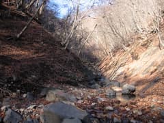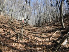 登山道に入り、急登わずかで尾根上の鞍部に出、反対側の谷急沢に下る。下るところの急斜面のトラバースは踏み跡が消えかかっていて、滑りやすい。沢に降りてからも、岩の上に腐葉土が積もったような足場の悪いトラバースが続く。しかし、赤ペンキのマークはあるので、これを注意深く拾えば迷うことはない。