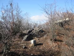 200mくらい沢沿いに歩いたあと、右に登って沢と別れ、枯れ葉の気持良い斜面を詰め上がって枝尾根に出る。一休みしてミカンを食べていると、ガォという声が上の尾根の方でする。見ると大きな影がひとつと小さな影が2,3、左右に走り回っている。最初は熊か!と思ったが、良く見るとどうも猪らしい。